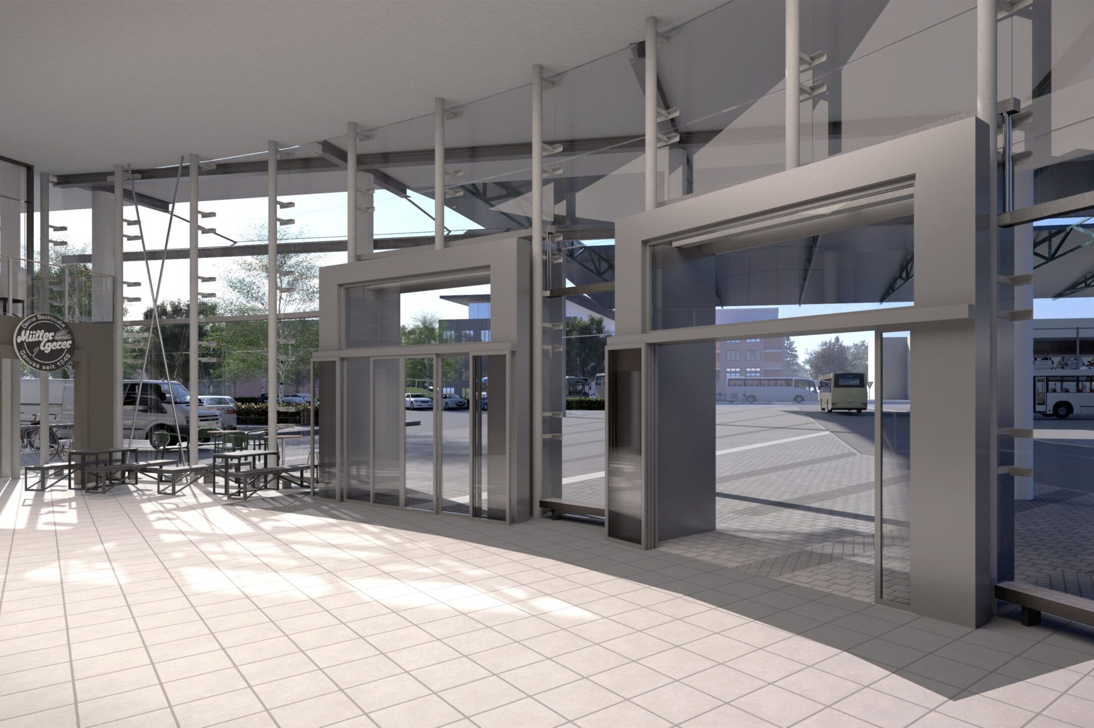 Im Mittelpunkt stehen die beiden bestehenden Drehgelenktüren, die durch neue, großzügig dimensionierte Türanlagen ersetzt werden. Sowohl die lichte Durchgangsbreite als auch die Höhe der Eingänge werden erheblich vergrößert, um die Zugänglichkeit zu verbessern und den hohen Nutzerfrequenzen besser gerecht zu werden. Die neuen Türen werden als Schiebetüranlagen ausgeführt, um die Betriebssicherheit und Zuverlässigkeit dauerhaft zu erhöhen.